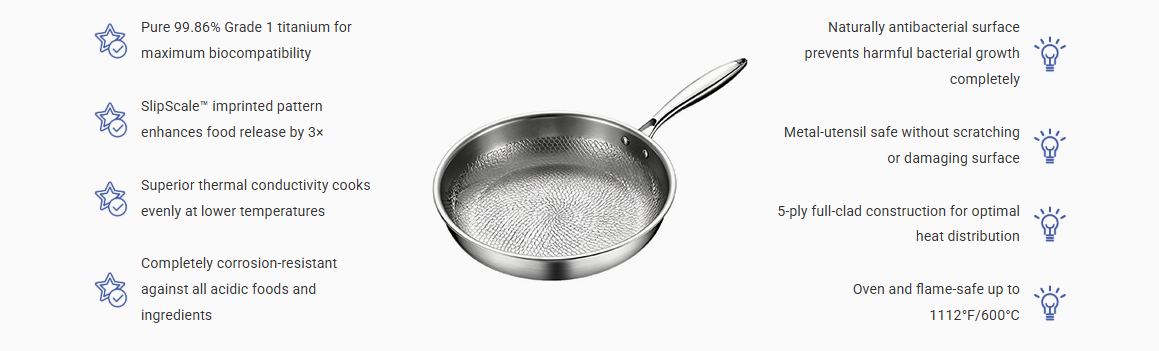 - ✅ Absolute Safety: Zero Coating, Zero Teflon, Zero PFAS. We utilize the natural antibacterial properties of pure titanium and physical non-stick technology to build your line of defense for health.
